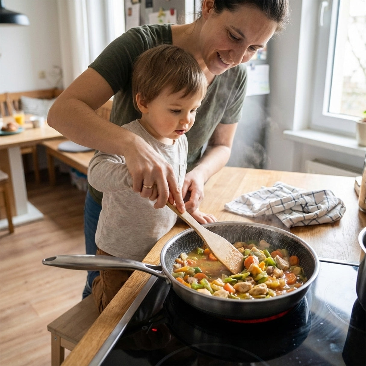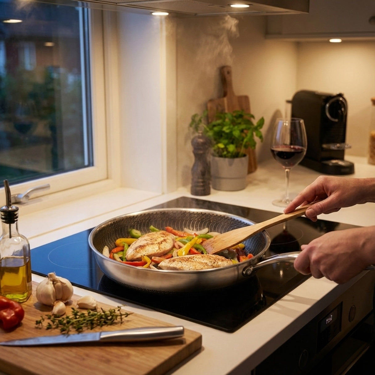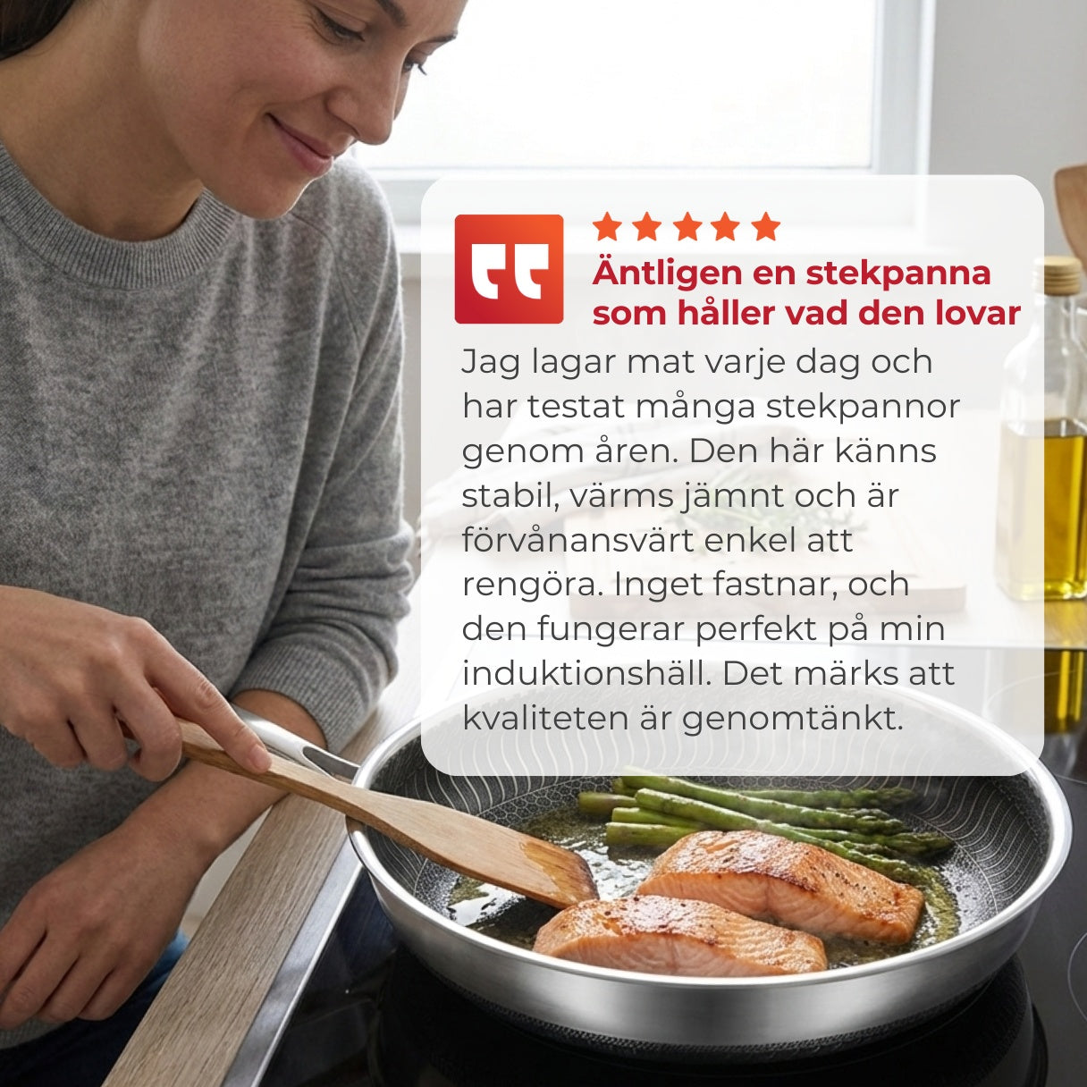 Det ger en mer hållbar stekpanna med jämn värme, bättre kontroll och ett materialval du kan känna dig trygg med i vardagen.